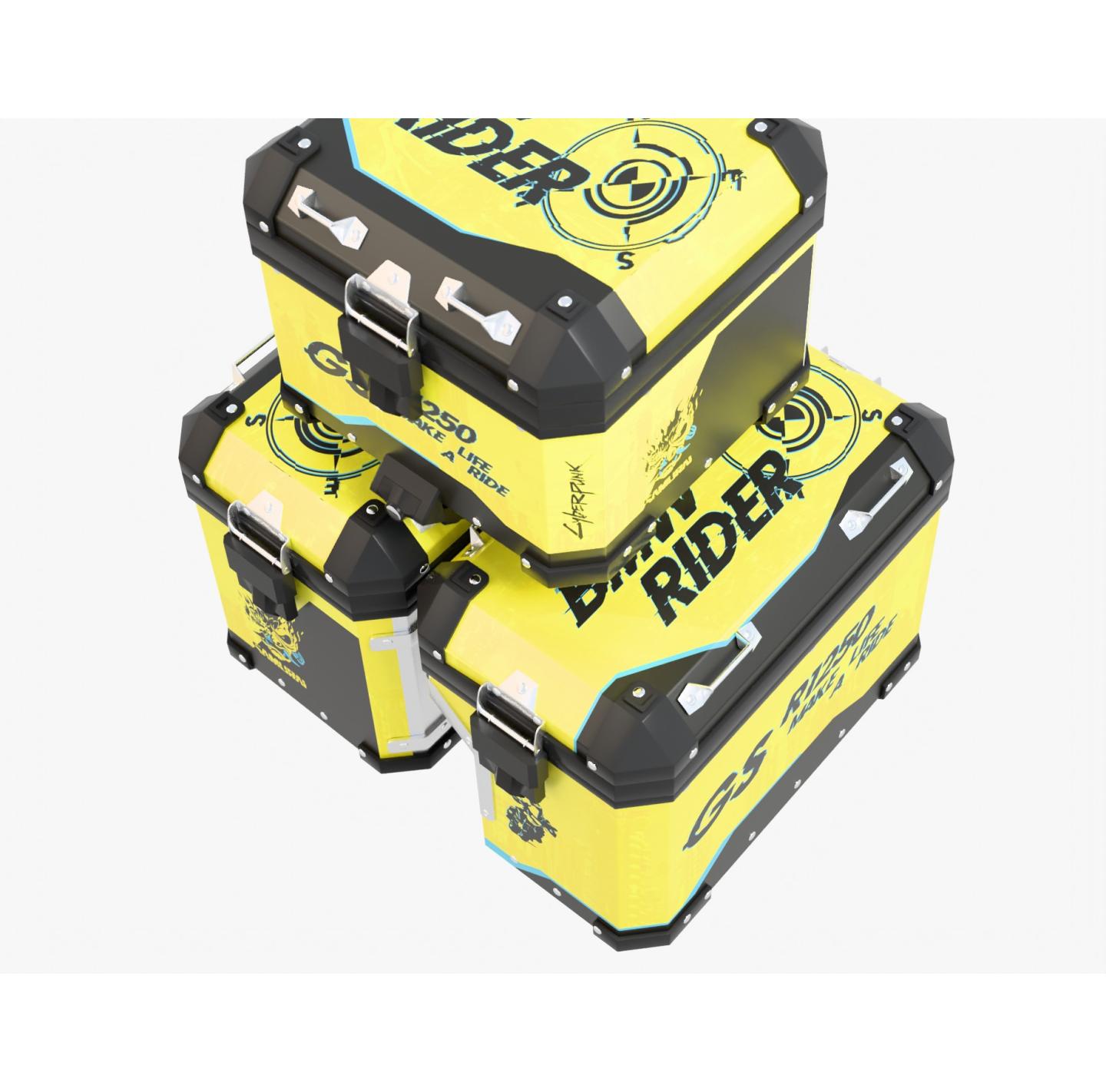 For side cases - contains a set of wraps for the two side panniers of the motorcycle.