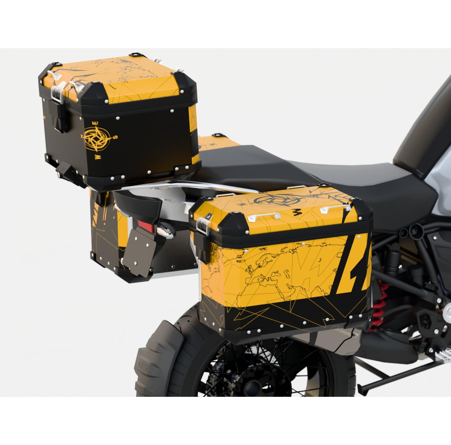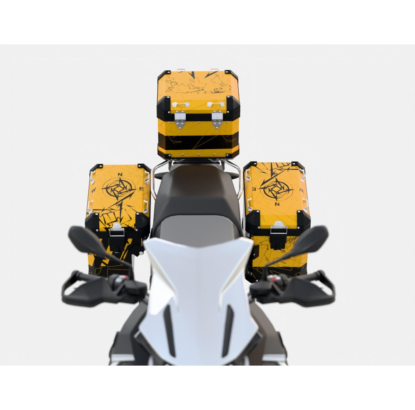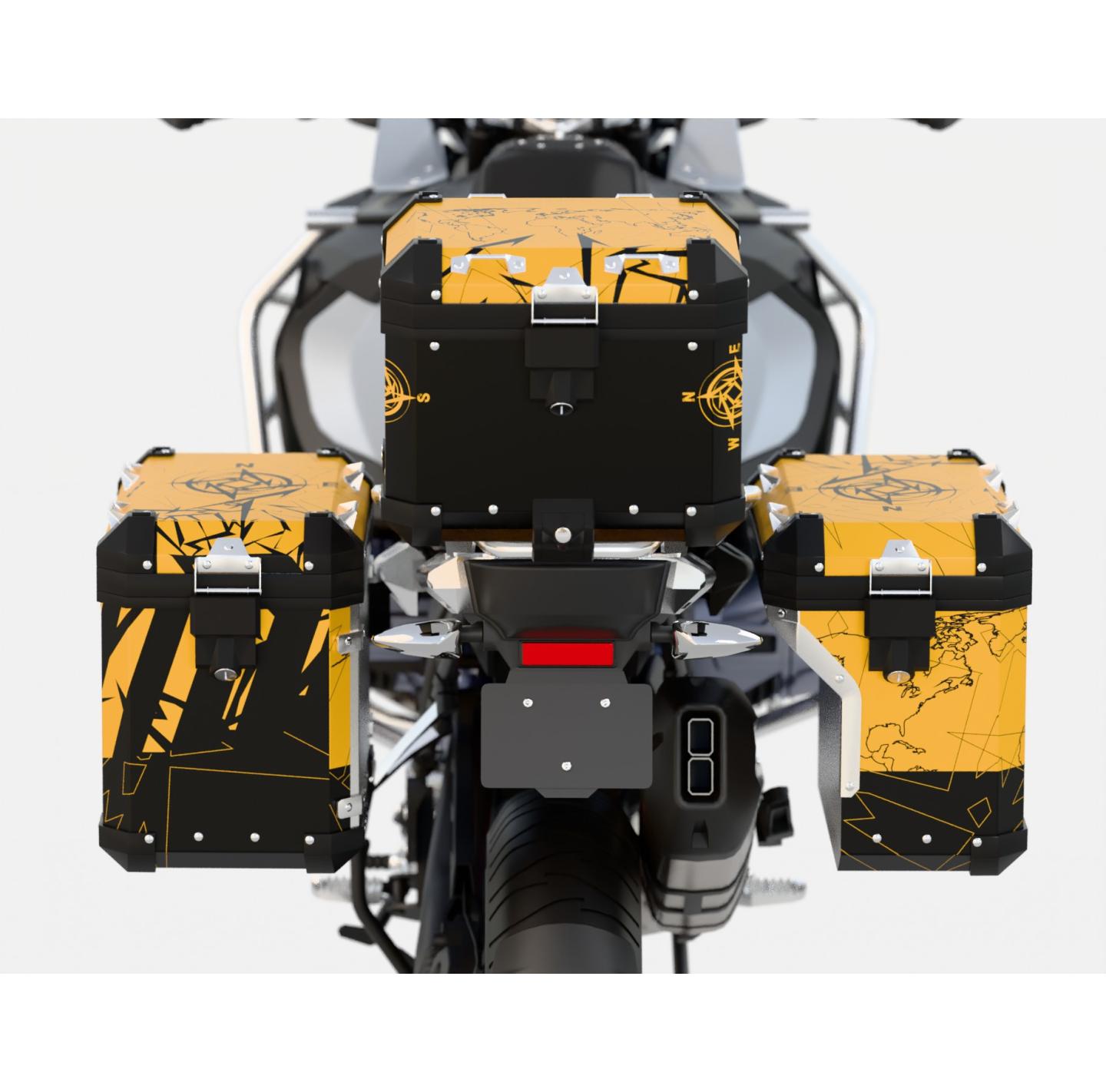 For side cases - contains a set of wraps for the two side panniers of the motorcycle.
